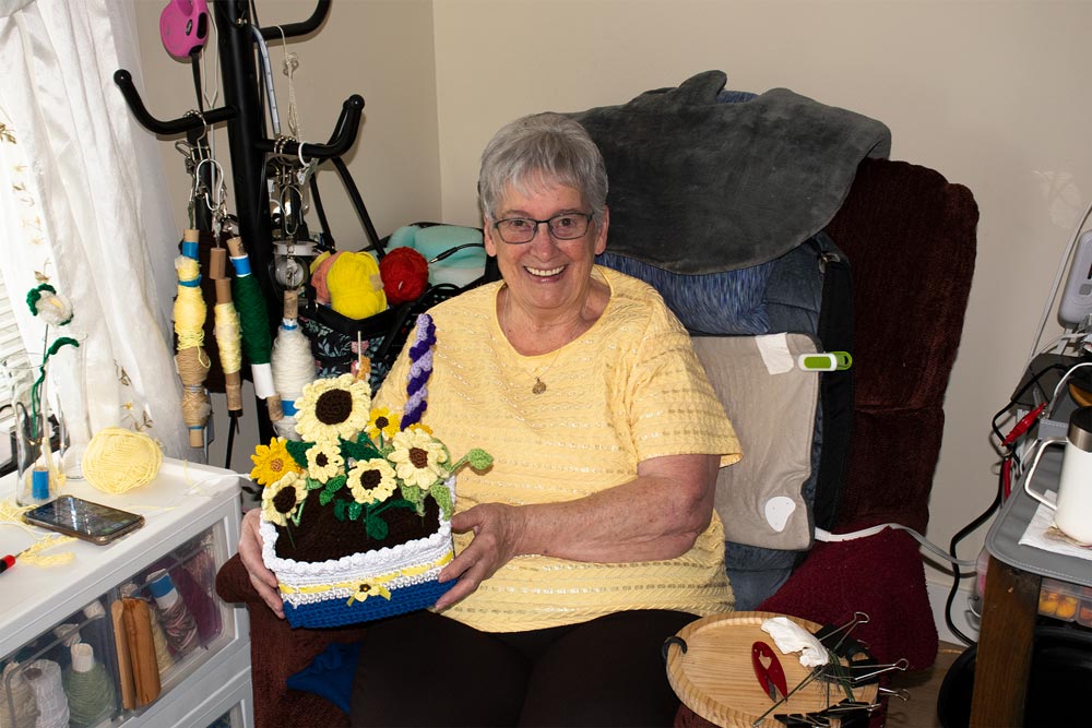Sandi keeps herself wonderfully productive with her crafting which she enjoys immensely. She established her craft-corner in the living room, with her comfortable chair and her well-thought-out, self-engineered yarn distribution system, making it easy to work efficiently. Here Sandi creates some amazing crocheted items from lifelike potted plants to many decorative works of art, which she either gifts or uses to decorate her apartment!